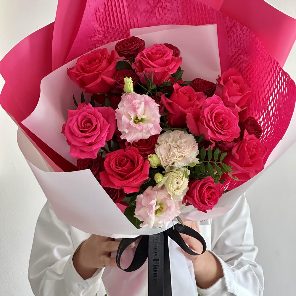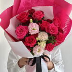 Притягивающий взгляд букет из роз цвета фуксии и тёмно-красных кустовых роз, излучающий страсть и элегантность. Яркие цвета прекрасно дополняются нежно-розовым лизиантусом, добавляющим нотку изящества и утончённости. Пышная зелень фисташки связывает всё воедино, создавая идеальный баланс насыщенных оттенков и текстур. Эта эффектная композиция – признание в любви и торжестве, идеально подходящая для тех, кто ищет цветочный подарок, такой же яркий и уникальный, как и повод, которому он посвящён.