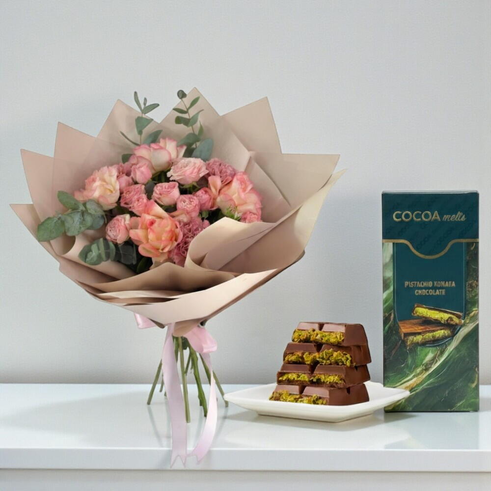 Ribbon - 1 шт. Eucalyptus - 3 шт. Pink rose - 4 шт. Wrapping - 4 шт. pink carnation - 3 шт. розовые мини-розы - 3 шт. шоколадный батончик кунафа с фисташками (160 г) - 1 шт.