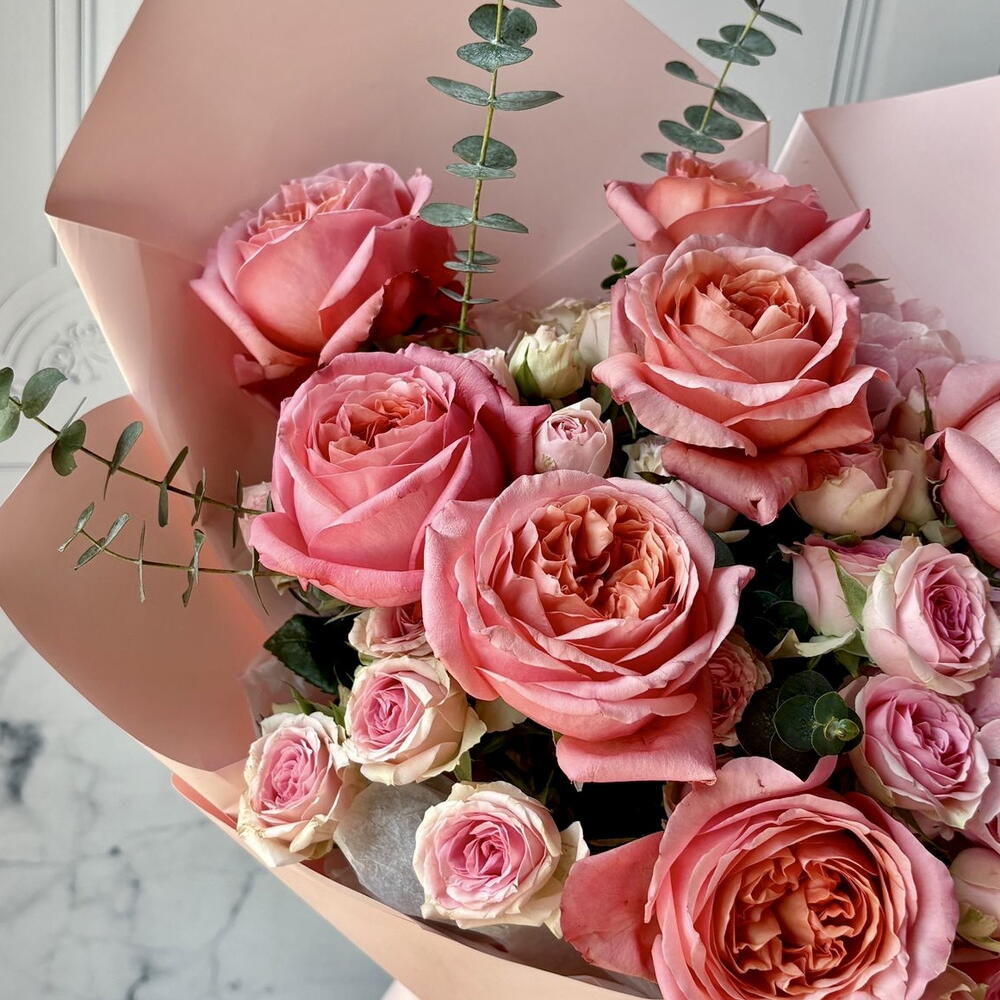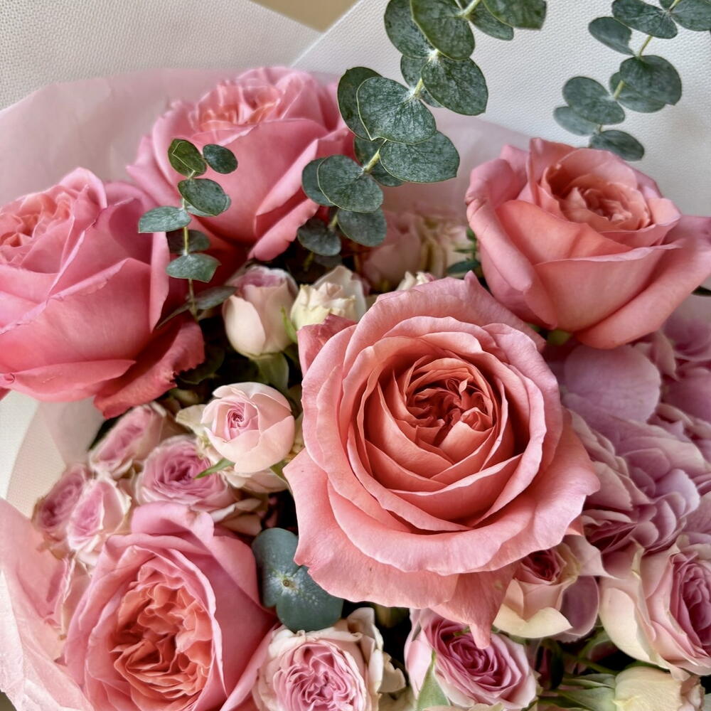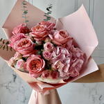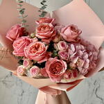rose pink expression - 7 шт. spray rose dinara - 5 шт. wrapping l - 1 шт. blad eucalyptus spray baby blue - 2 шт. hydrangea bloom pink - 2 шт.