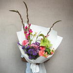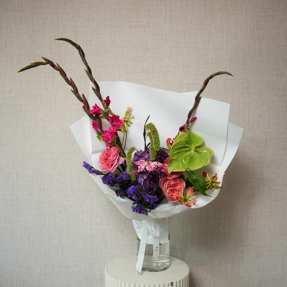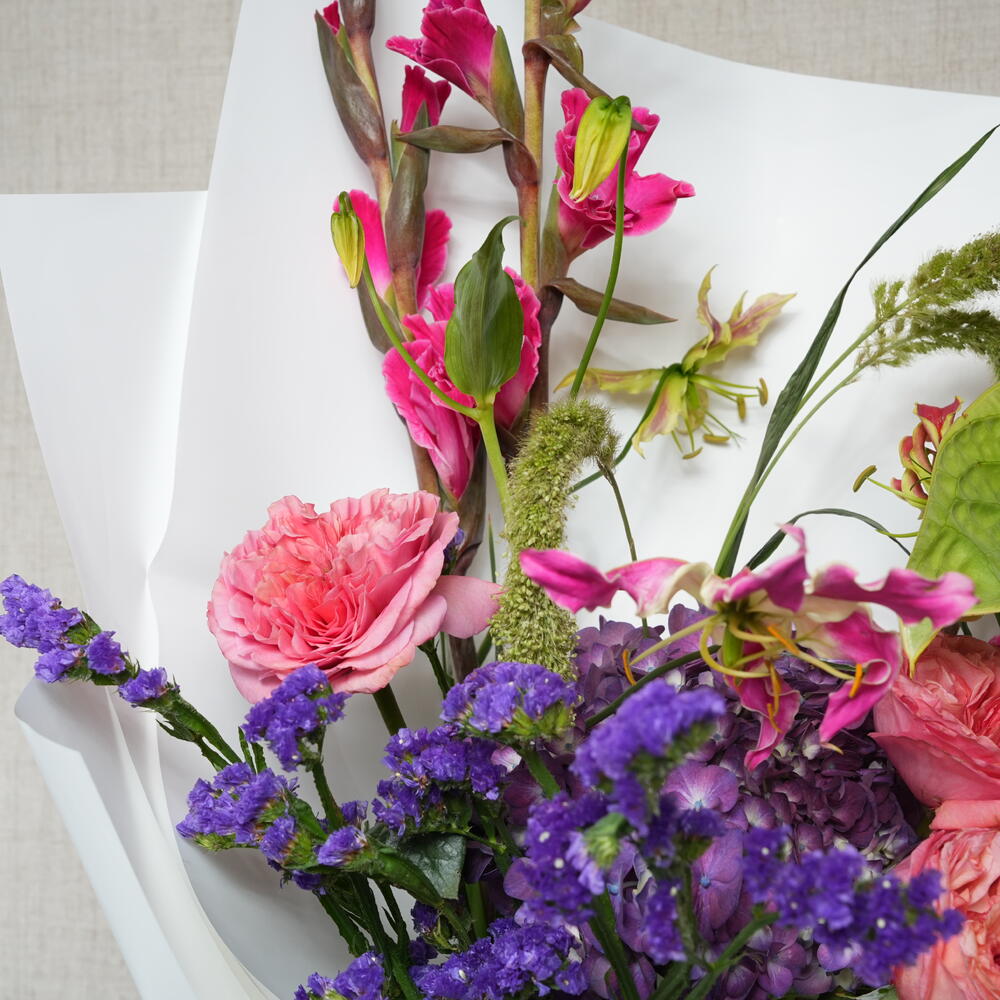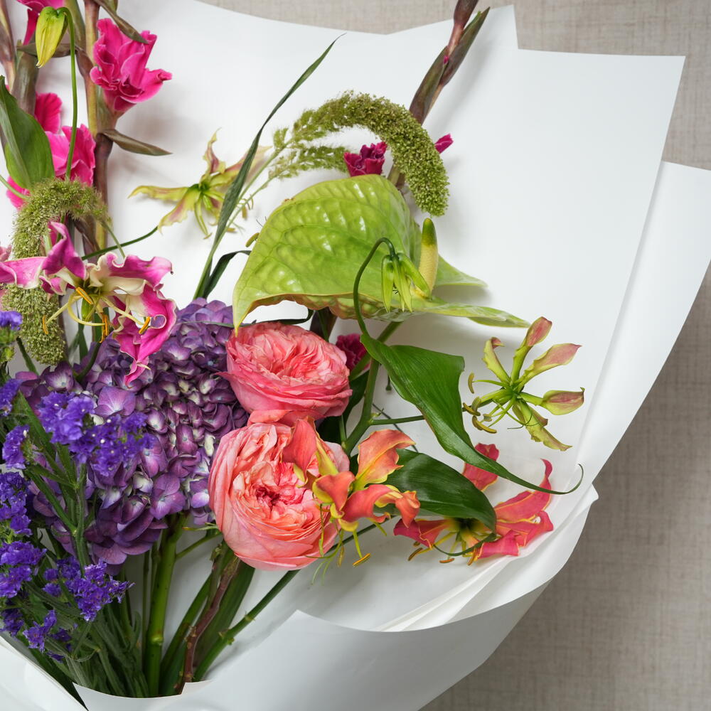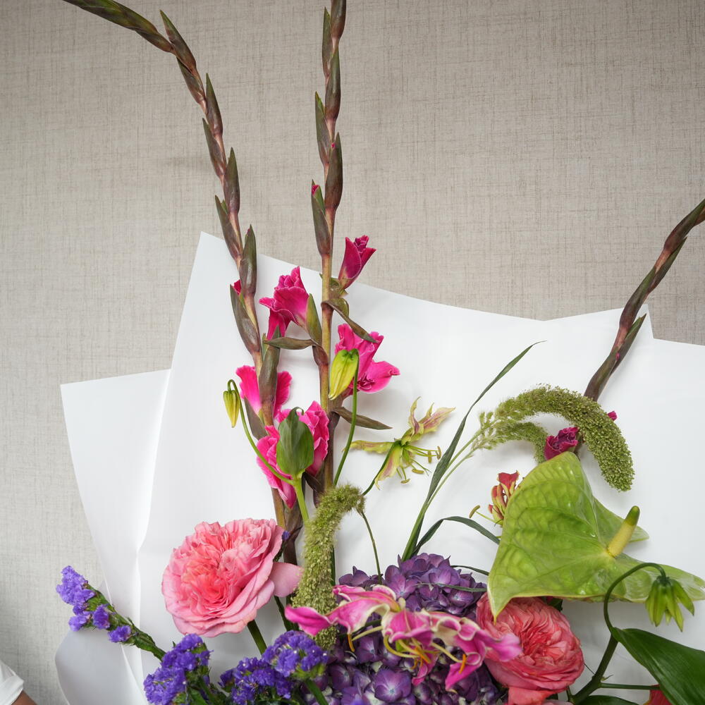 Statice - 5 шт. Антуриум - 1 шт. hydrangea purple - 1 шт. setaria - 3 шт. гладиолус - 3 шт. gloriosa - 2 шт. розы пинк экспрешн - 3 шт.