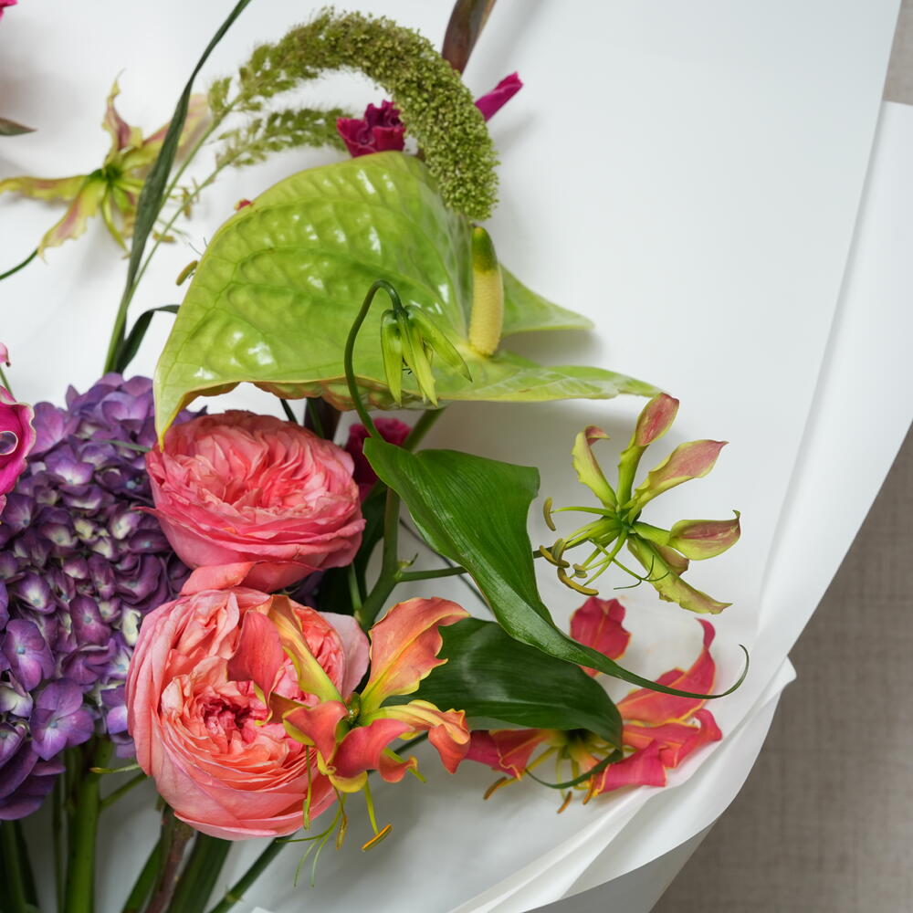 Смелое и элегантное сочетание гладиолусов, роз Pink Expression, гортензии, глориозы и зелёного антуриума. Яркий букет для грандиозных торжеств.