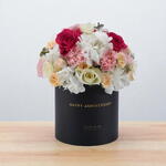 pink carnations - 7 шт. white hydrangea - 1 шт. white roses - 7 шт. свежий эвкалипт - 5 шт. персиковые спрей-розы - 3 шт. розы Pink Floyd - 3 шт.