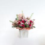 Букет из роз, кустовых роз, дельфиниума и других цветов в сумке.