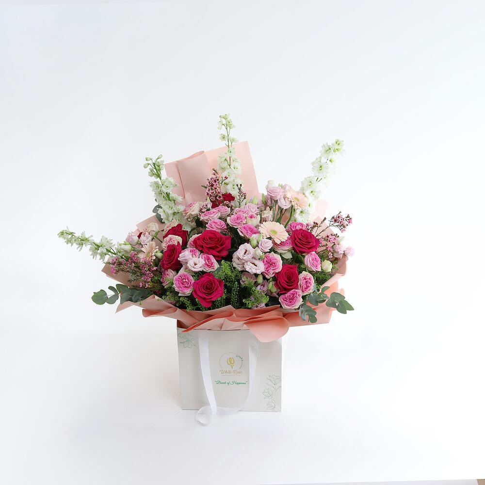 Букет из роз, кустовых роз, дельфиниума и других цветов в сумке.