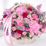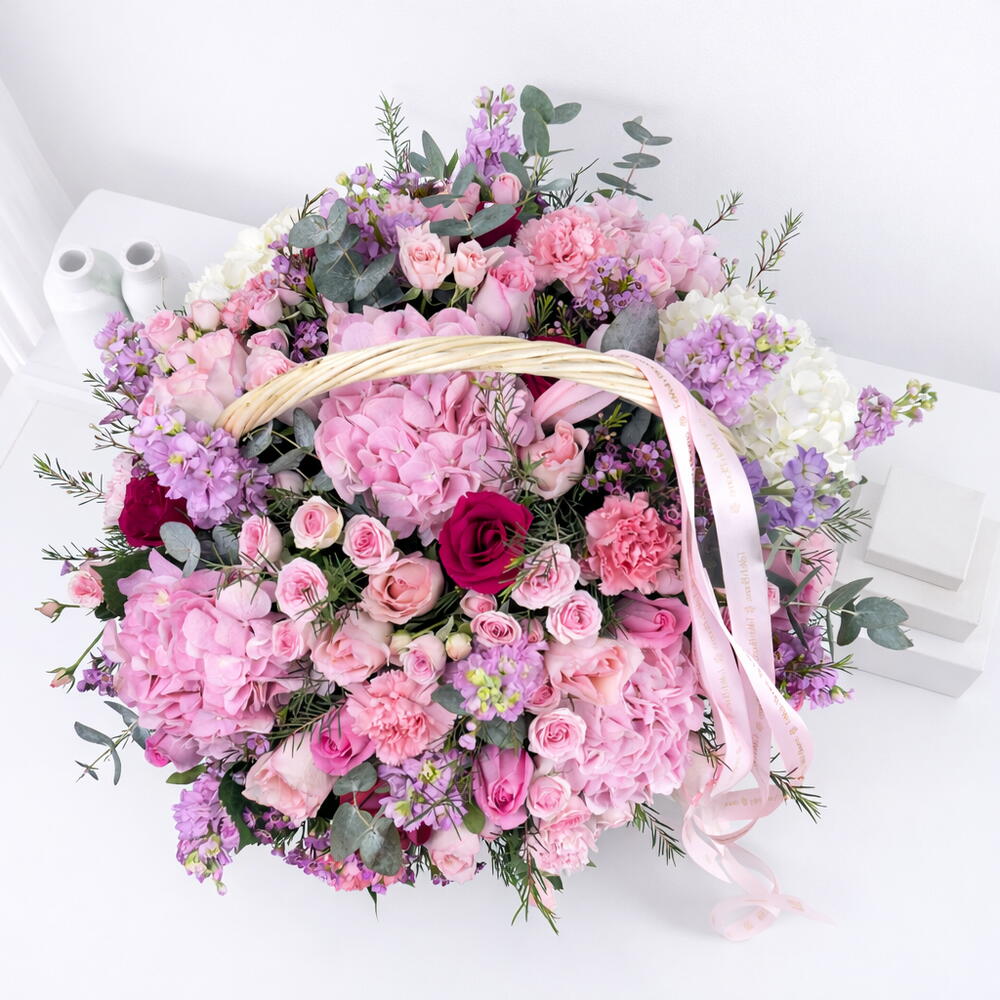 pink hydrangeas - 4 шт. листья рускуса - 10 шт. eucalyptus leaves - 7 шт. белые гортензии - 2 шт. розовый воск - 7 шт. большая корзина - 1 шт. темно-розовые розы - 10 шт. розы Пинк Ривайвал - 10 шт. розовая маттиола - 10 шт. стебли розовых спрей-роз - 10 шт. махровые розовые (jumelea) розы - 15 шт.