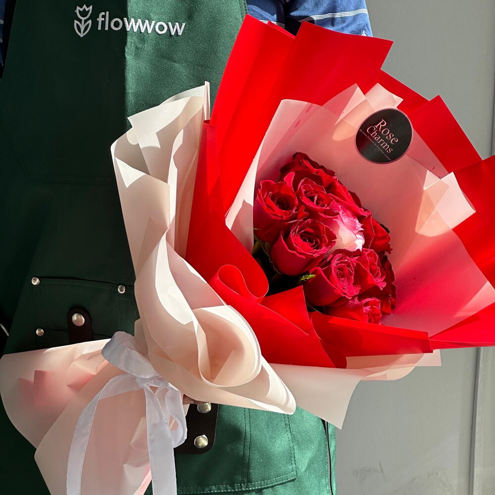 Сделайте особенные моменты еще ярче с этим моно-букетом, заботливо составленным из 10 сияющих красных роз и одной очаровательной розовой. Каждый цветок звучит как симфония романтики и элегантности, а изящная лента собирает букет воедино, делая его идеальным подарком, чтобы выразить свои чувства по любому поводу.