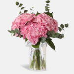 Наслаждайтесь элегантностью свежих розовых гортензий, красиво расположенных в стильной вазе и дополненных душистыми листьями эвкалипта. Этот очаровательный цветочный ансамбль привносит мягкость и изысканность в любое пространство, делая его идеальным для подарка или чтобы украсить ваш дом. Вневременное проявление природной красоты и нежного очарования.