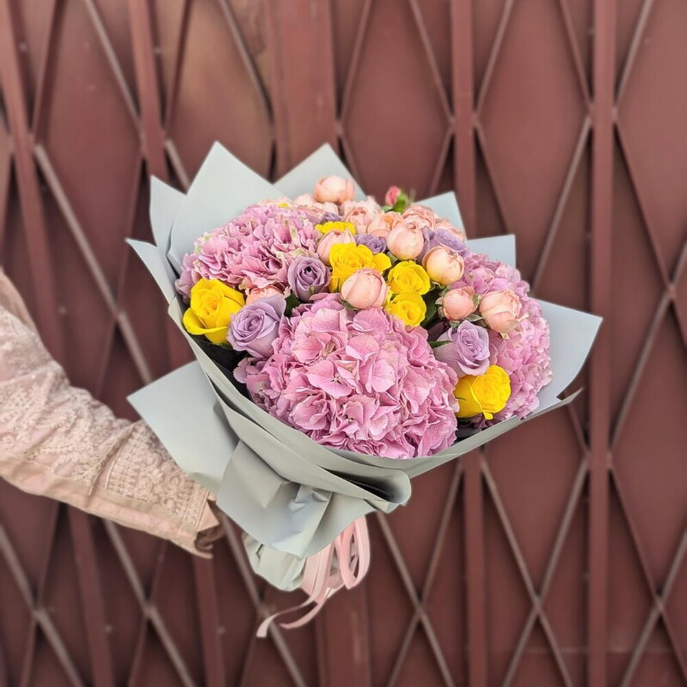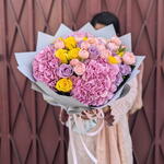 Yellow rose - 10 шт. violet rose - 10 шт. pink hydrangea - 3 шт. кустовая роза Джульетта - 5 шт.