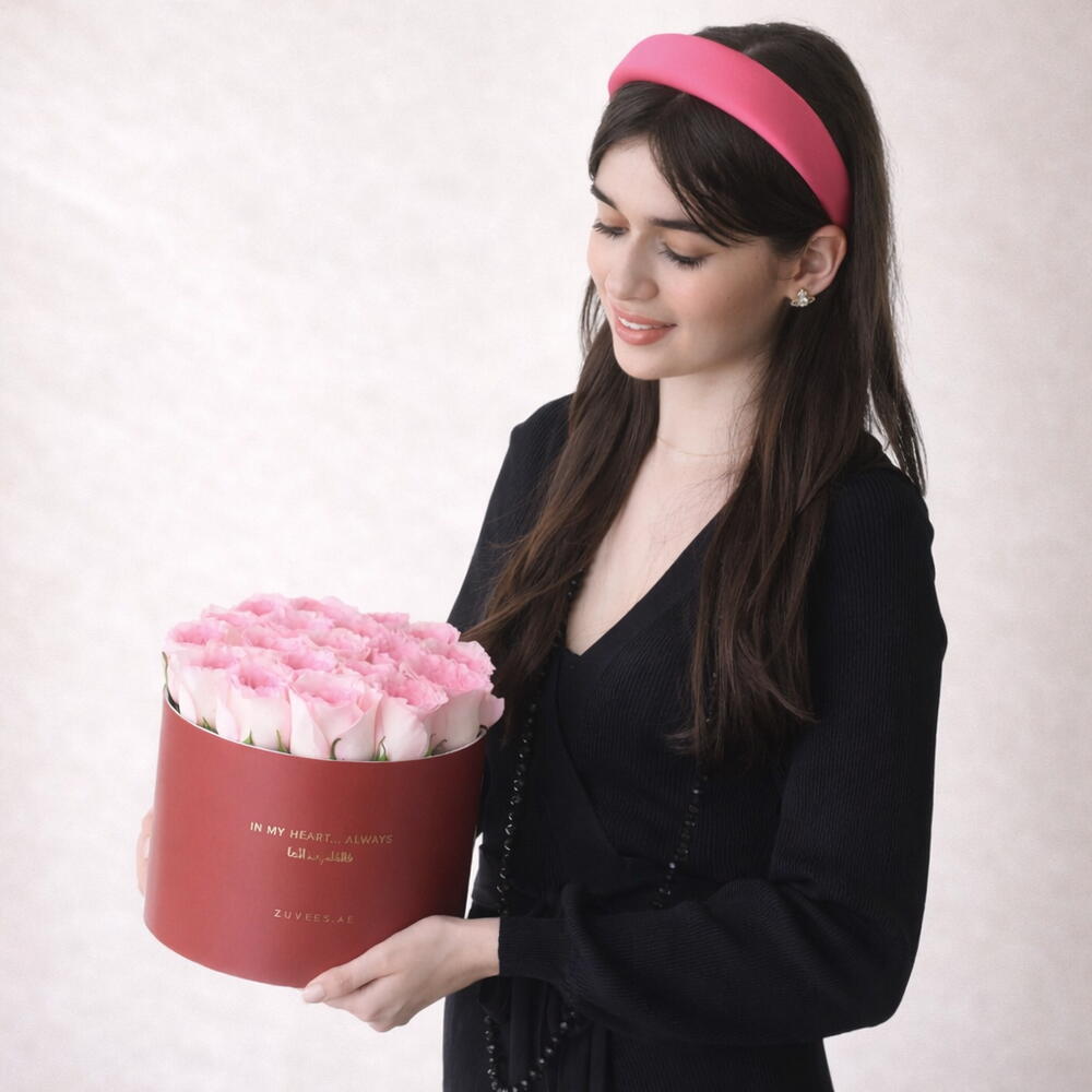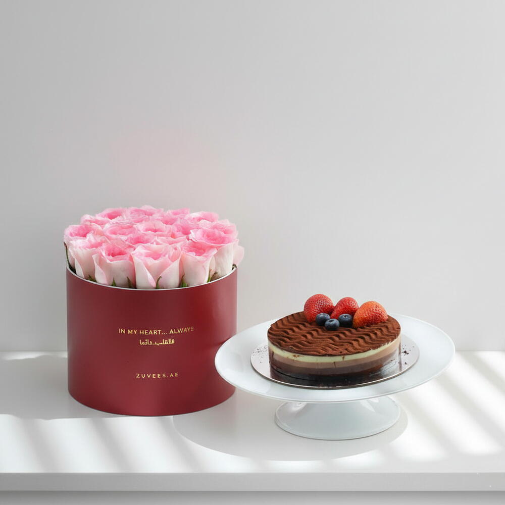 Нежный и светлый жест в честь Дня святого Валентина. Набор Pink in Bloomlight In My Heart Box Cake Combo включает 19–23 розовые розы премиум-класса, изящно расположенные в большой круглой коробке с надписью «В моем сердце… Всегда», красиво оформленной на английском и арабском языках. В сочетании с полукилограммовым тортом из тройного шоколада это сочетание цветочной нежности и изысканного наслаждения — любовное послание, искреннее, теплое и незабываемое.