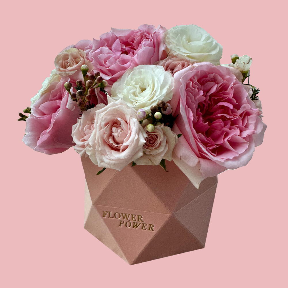 Eustoma - 1 шт. Spray rose - 2 шт. Box - 1 шт. hydrangeas - 1 шт. garden rose - 6 шт. chamelaucium - 2 шт.