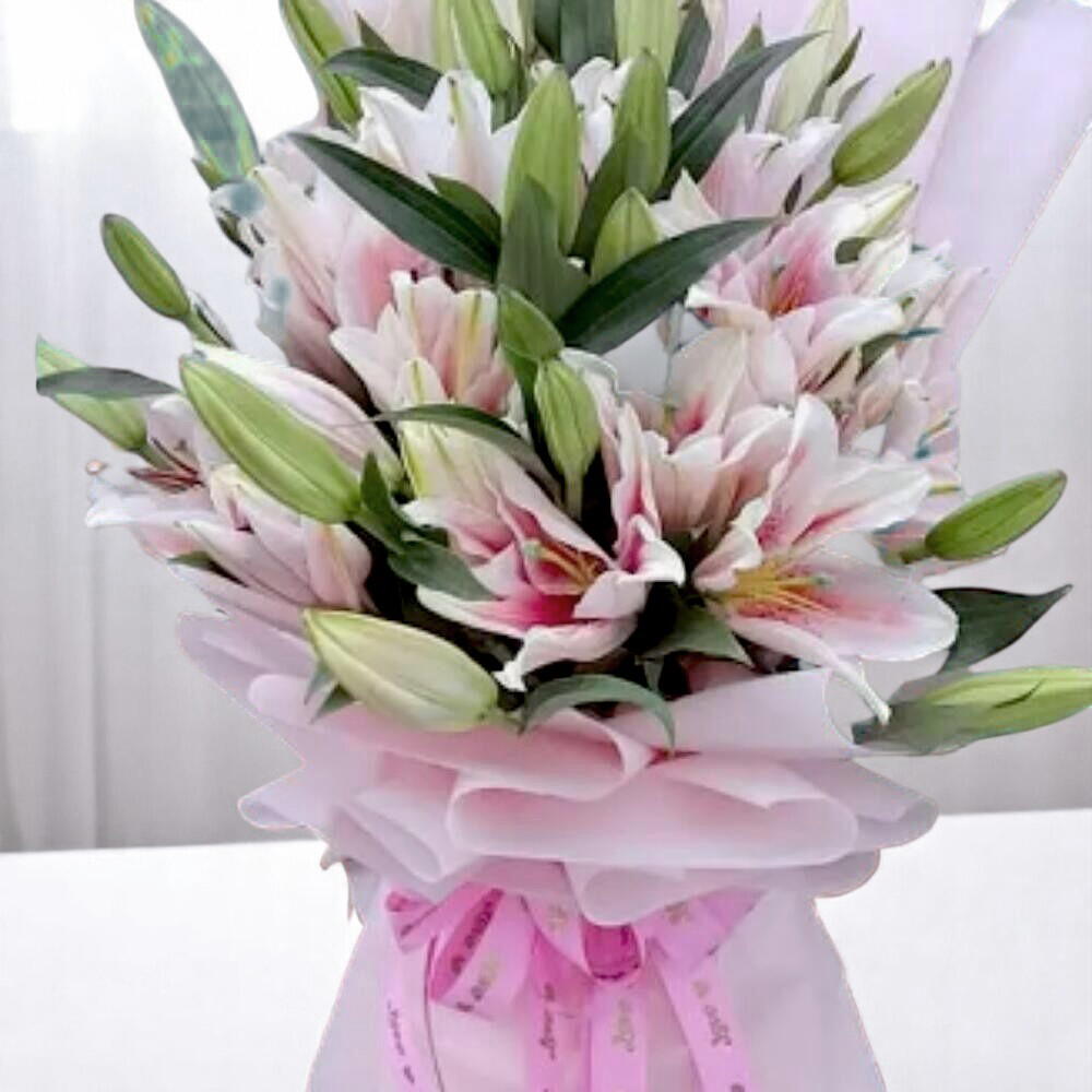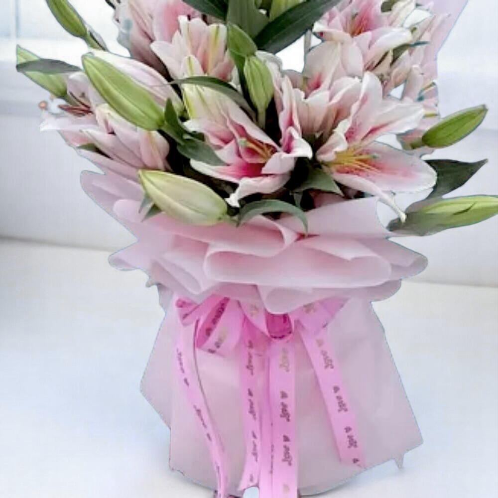 Потрясающий букет розовых лилий, эта композиция излучает элегантность и изящество. Нежный румянец лепестков гармонично сочетается с мягкой зеленью бутонов и листвы, делая его идеальным подарком для любого романтического или праздничного случая. Упакованный в нежную розовую бумагу и перевязанный очаровательной лентой, он придаёт вашим чувствам изысканную нотку. Для продления свежести поместите букет в чистую вазу с прохладной водой и подрезайте стебли под углом каждые два дня. Берегите от прямых солнечных лучей и сквозняков. При правильном уходе эти лилии прекрасно распустятся и наполнят ваше пространство нежным ароматом. Изображение на веб-сайте носит справочный характер, и фактический товар может отличаться по форме и размеру. Но не волнуйтесь, Tulips flowers делает всё возможное, чтобы воспроизвести показанный товар. Цветы могут быть доставлены в полном цветении, полуоткрытыми или в стадии бутона в зависимости от наличия. Выбранное вами время доставки является ориентировочным и может варьироваться в зависимости от местоположения и выбранных вами цветов. Возможно, цветы придётся заменить в зависимости от наличия или региональных ограничений.