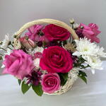 Эта очаровательная корзина с цветами – восхитительное сочетание элегантности и изящества, составленное из идеально сочетающихся между собой цветов. В ней представлены 2 красные розы, символизирующие истинную любовь, 8 ярких хризантем, символизирующих радость и оптимизм, 4 нежные розовые розы, выражающие благодарность, и 3 маленькие гвоздики, олицетворяющие чистую любовь и удачу. Каждый цветок подобран вручную и составлен для создания этого восхитительного шедевра, что делает его идеальным подарком на любой случай, способным озарить лица ваших близких улыбкой и сделать их день особенным.