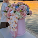 Lisianthus - 15 шт. rose white ohara - 15 шт. rose pink mondial - 15 шт. скиммия зелёная - 10 шт. гортензии разных цветов - 30 шт. орхидея персиковая - 1 шт.