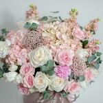 Composition: Dianthus - 5, Ozothamnus - 3, Rose Pink Expression - 6, Hydrangea - 2, Rose White Ohara - 3, Mattiola - 4, Tulip - 9, Rose sprey Madame Bombastic - 5, Eucalyptus - 3, box - 1, ribbon - 1 Sizes: WIDTH - 35CM; HEIGHT - 40CM; LENGTH - 40CM; (including packaging) Размер: 35 x 40 x 40 см