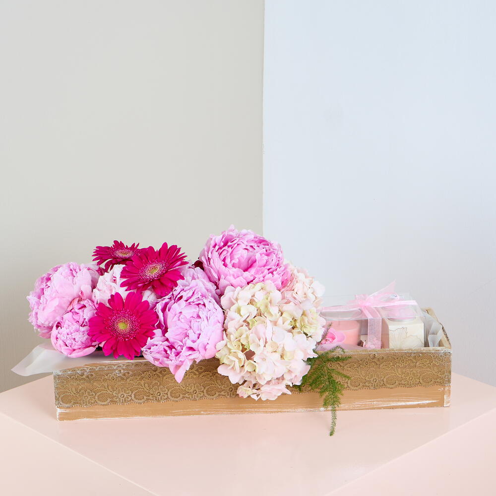 Отпразднуйте каждый особенный момент с этой элегантной розовой цветочной композицией! С роскошными пионами и смелыми герберами, эта потрясающая композиция — воплощение женственного очарования. В сочетании с восхитительным подарочным набором свечей она идеально подходит, чтобы побаловать того, кого вы любите. Будь то на день рождения, годовщину или просто чтобы скрасить чей-то день, эта композиция произведёт незабываемое впечатление. Пусть этот продуманный подарок принесёт тепло и радость, оставив тёплые воспоминания. Детали подарка: Пион Гербера Гортензия Аспарагус Деревянная коробка
