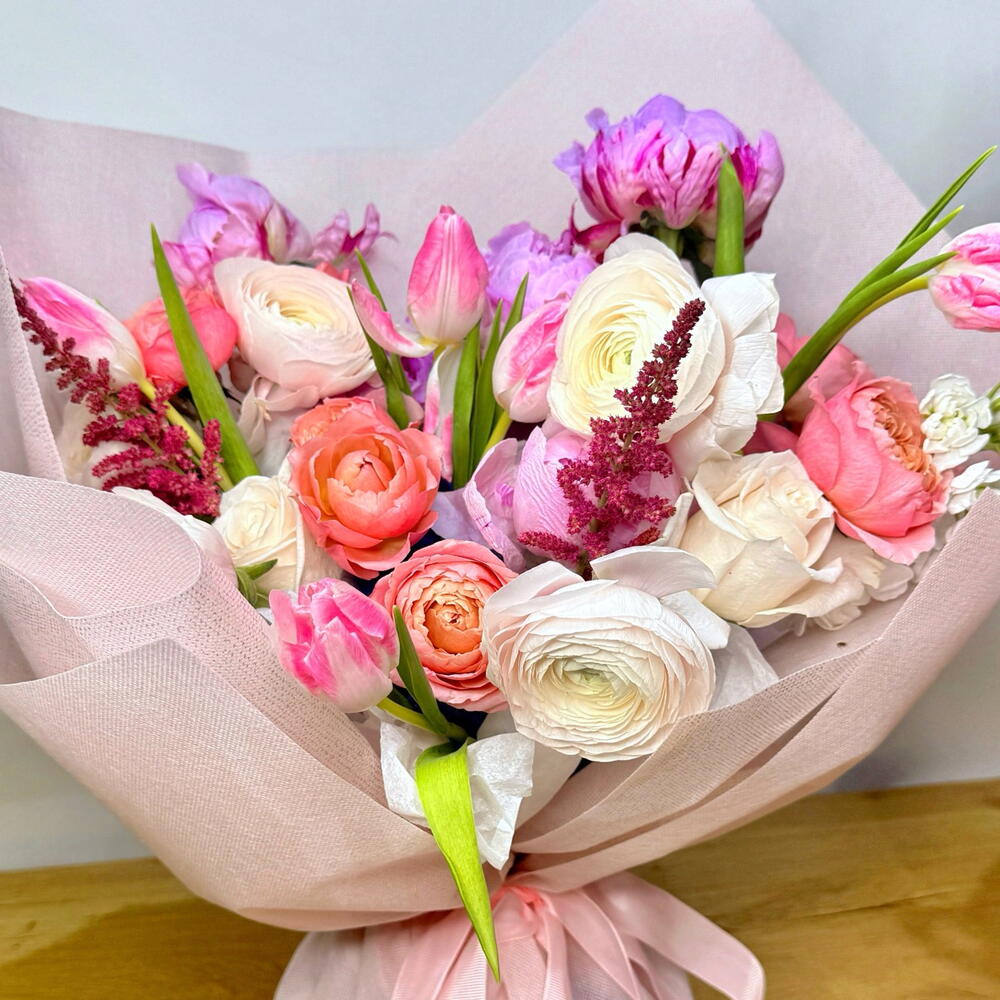 White rose - 4 шт. Peony pink - 4 шт. ranunculus - 4 шт. juliet rose - 2 шт. pink tulip - 5 шт. розовая астильба - 3 шт. белая маттиола - 2 шт.