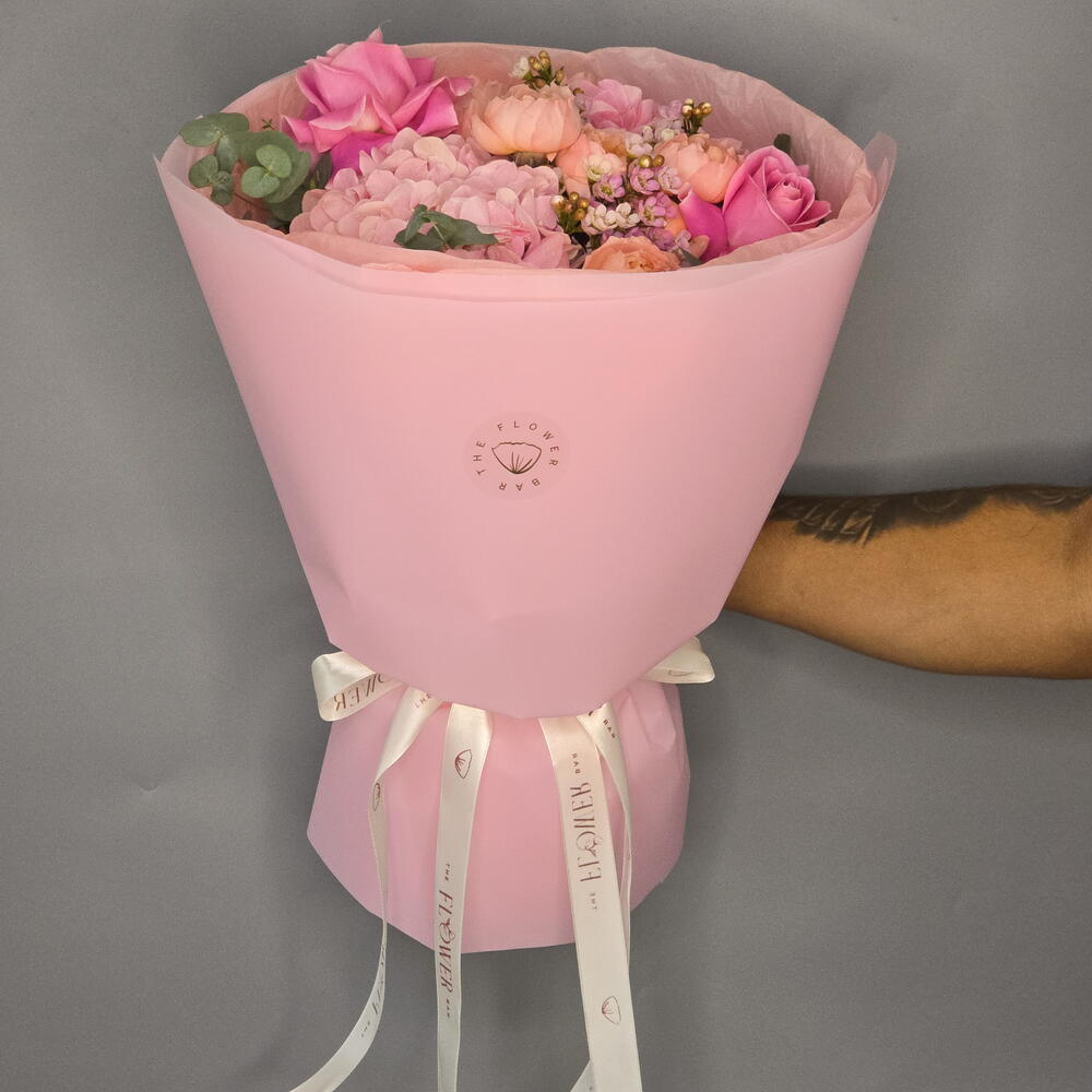 Букет «Pink Perfect» Наш букет «Pink Perfect» – это потрясающее воплощение элегантности и женственности. Это сияющая композиция, созданная для того, чтобы пленить сердца. В состав этой композиции, созданной вручную, входят: 2 розовые гортензии – пышные и пышные, придающие букету объем и очарование. 3 розовые розы – классика, неподвластная времени, цветущие с изяществом. 2 кустовые розы сорта «Julietta» – нежные и романтичные, с характерными пучками лепестков. 3 восковых цветка – изящные и фактурные, придающие букету нежность. Этот букет, искусно составленный флористами The Flower Bar, окутан дополнительными оттенками розового, пробуждающими тепло, нежность и любовь. Будь то праздник или просто так, букет «Pink Perfect» – идеальный выбор для тех, кто обожает все изящное и розовое.
