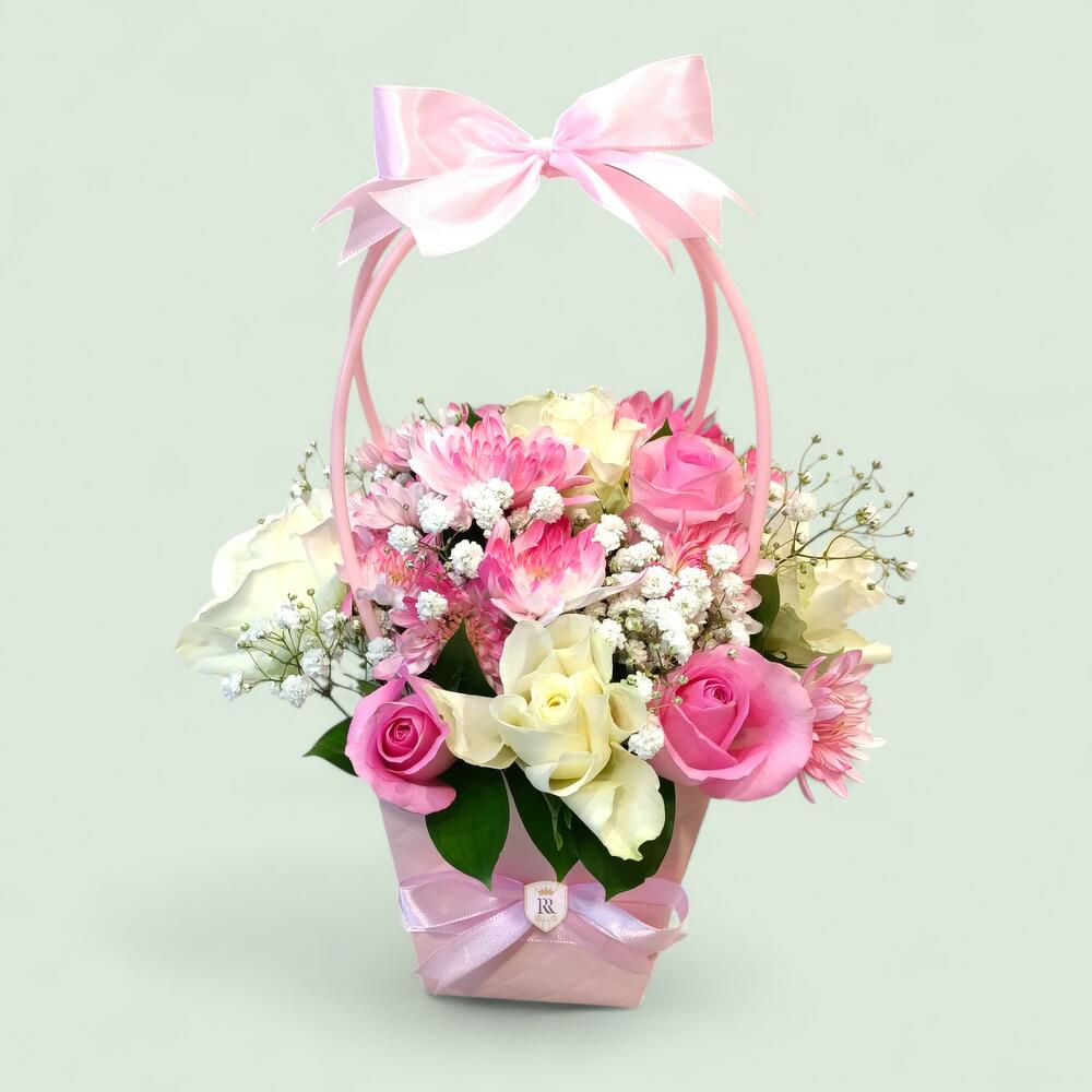 Очаровательная цветочная композиция в корзинке с розовой ручкой, в которой сочетаются розовые розы, белые и розовые хризантемы и нежная белая гипсофила. Большой розовый бант украшает ручку, а меньшая розовая ленточка завязана вокруг основания.