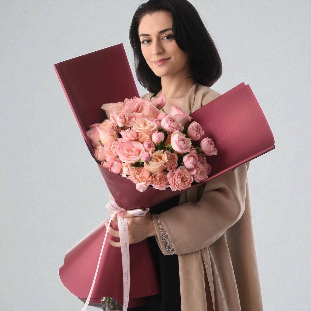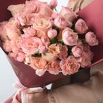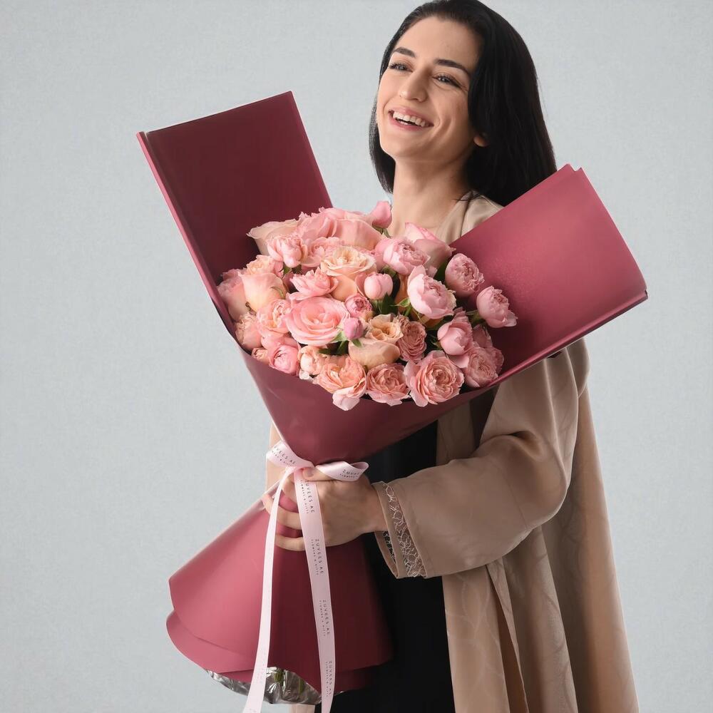 Выразите свои самые искренние чувства с помощью букета «Розовые лепестки» – романтической композиции из 20 роз премиум-класса: 5 роз сорта «Эсперанс», 5 роз сорта «Шиммер» и 10 роз сорта «Розовая Джулита», дополненных 5 пышными ветками рускуса, придающими букету нотку зелени. Этот букет, упакованный в элегантную бордовую бумагу и перевязанный роскошной белой атласной лентой, излучает любовь и очарование, что делает его идеальным подарком на любой праздник. Эта композиция, созданная вручную опытными флористами, очаровывает и оставляет неизгладимое впечатление.