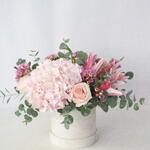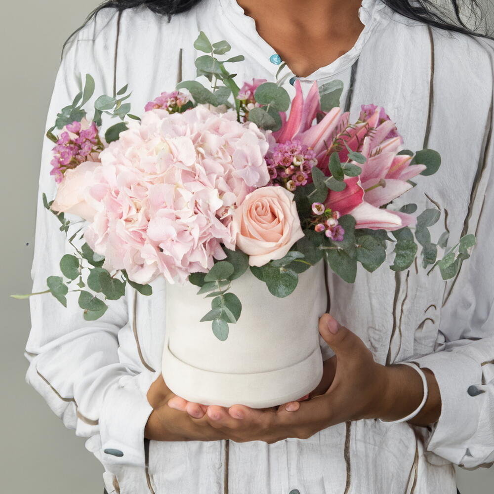 Тщательно подобранная коробка с цветами из розовых гортензий, нежно-розовых роз, эффектных лилий и восковых цветов. Композиция поставляется в бархатной коробке, которую можно использовать повторно, и она прекрасно смотрится на вашем туалетном столике!