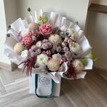 Откройте для себя изысканное сочетание элегантности и гармонии в наших фирменных букетах от флористов. Этот шедевральный букет состоит из пяти очаровательных ранункулюсов, пары пышных пионов, пяти эффектных окрашенных хризантем, трех хризантем сорта «Дейли Стар» и шести ярких сантини. Композицию дополняют четыре нежные мини-розы, два роскошных амаранта, два уникальных семенных коробочки и четыре креспедии. Это идеальное воплощение невероятной красоты природы, тщательно созданное, чтобы привнести радость и стиль в любое пространство.