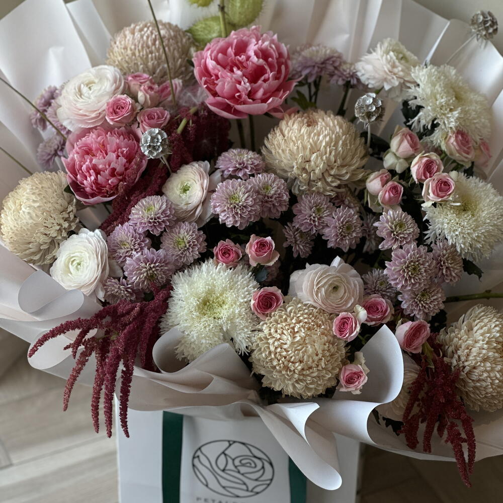 Peonies - 2 шт. santini - 6 шт. ranunculus - 5 шт. amaranthus - 2 шт. маленькая роза - 4 шт. цреспедия - 4 шт. окрашенная хризантема - 5 шт. хризантема Дейли Стар - 3 шт. стручок - 2 шт.