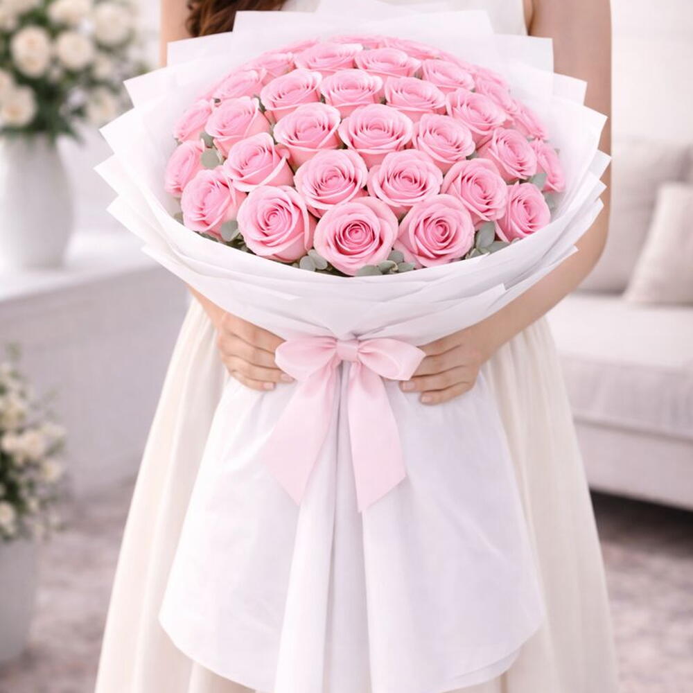 Потрясающая композиция из 24 свежих розовых роз, элегантно оформленных в премиальную белую упаковку с подходящей лентой. Этот красивый букет передаёт романтические и нежные чувства, идеально подходит для выражения любви, празднования годовщин или искренних поздравлений.