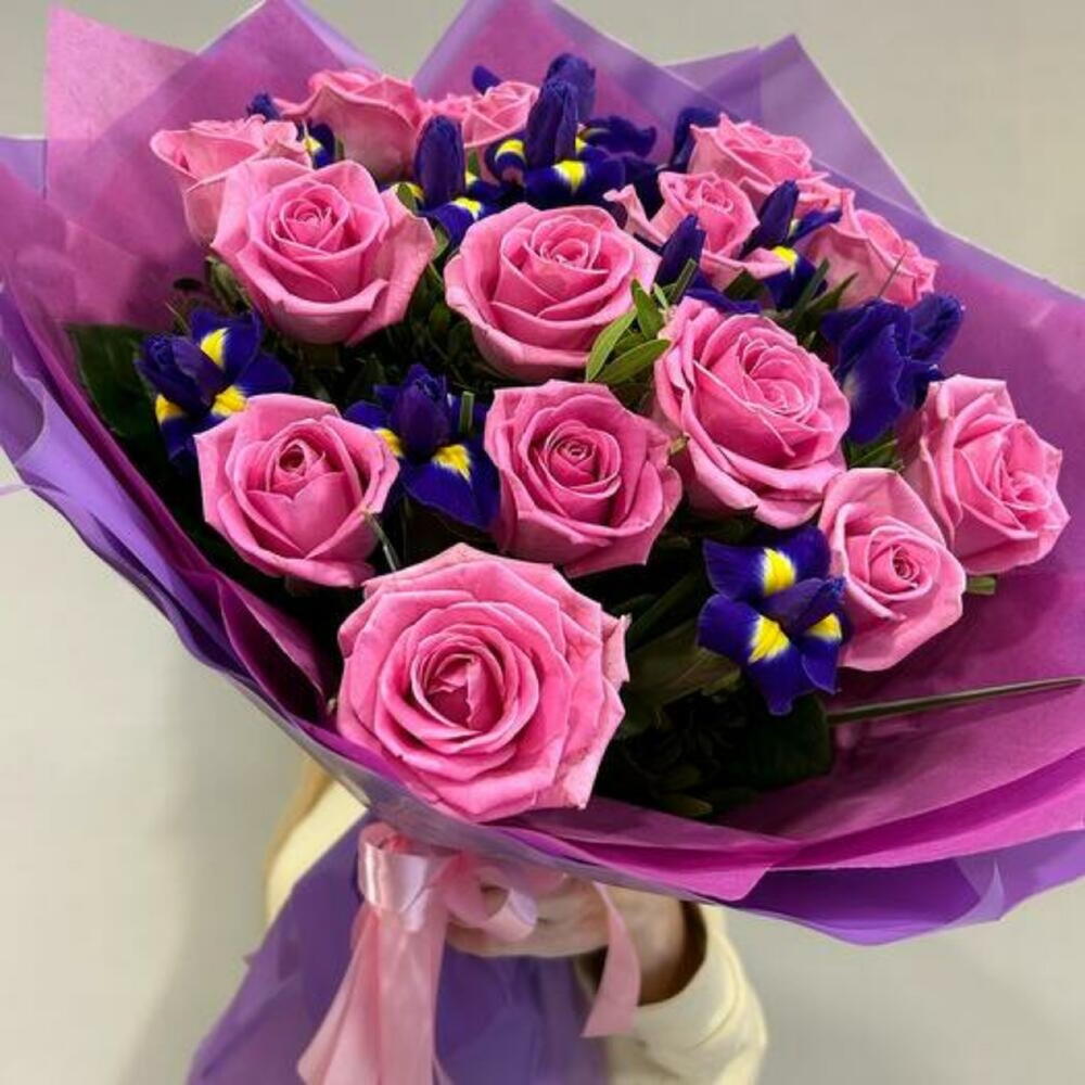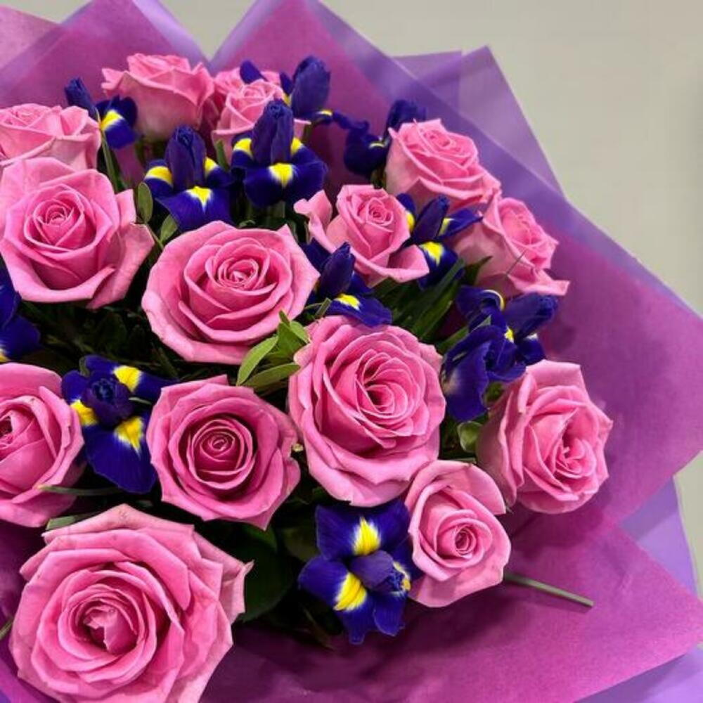 Празднуйте любовь и элегантность с нашим букетом, в котором изумительно сочетаются розовые розы и яркие фиолетовые ирисы. Нежные розы цвета румянца символизируют восхищение и грацию, а смелые, насыщенные оттенки ирисов добавляют нотку изысканности и загадочности. Идеален для годовщин, романтических жестов или любого особого случая, этот букет соединяет классическую красоту с выразительным контрастом, создавая завораживающий и запоминающийся подарок, который говорит от сердца.