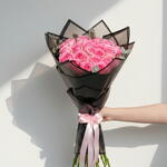 Букет, украшенный свежим эвкалиптом и завернутый в стильную чёрную полупрозрачную бумагу, создаёт поразительный контраст между мягкостью и современной роскошью. Идеально подходит для дней рождения, годовщин, романтических сюрпризов или искренних проявлений заботы.