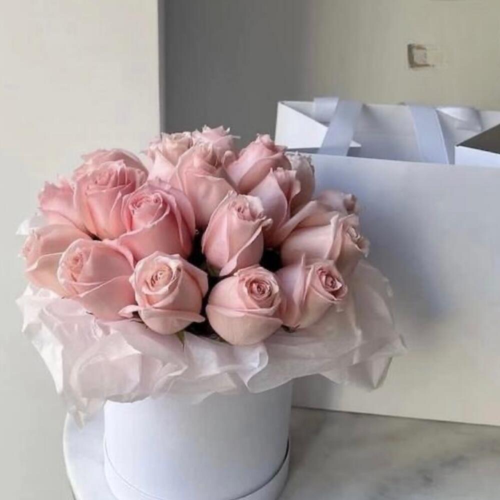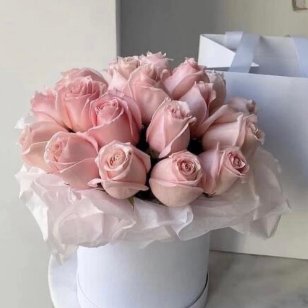 Satin ribbon - 1 шт. Pink rose - 19 шт. oasis floral - 1 шт. wrapping paper - 1 шт. hat box - 1 шт. card - 1 шт. good feelings - 100 шт. instruction - 1 шт.