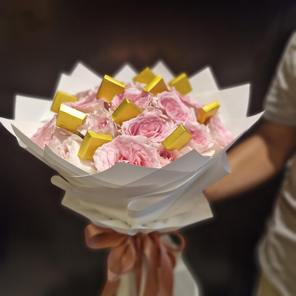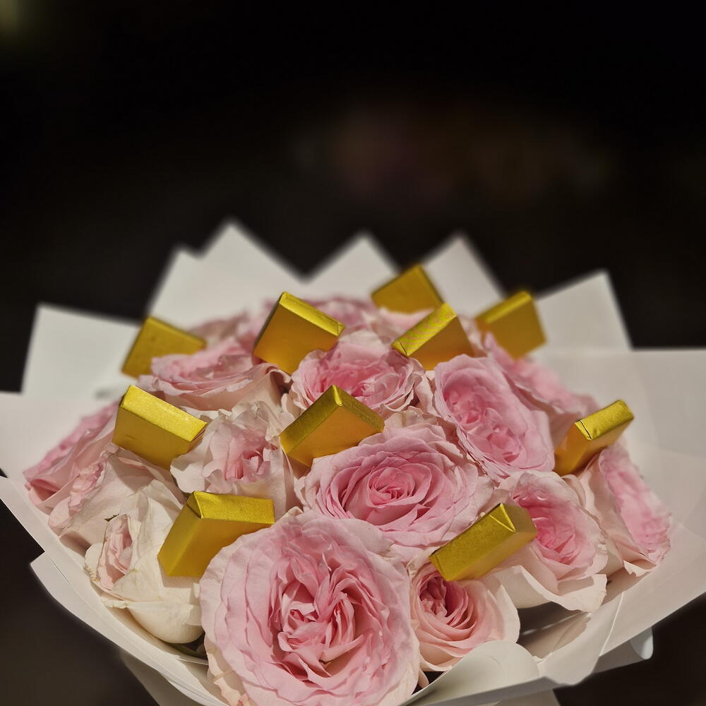 Потрясающий моно-букет, тщательно оформленный из 20 розовых роз, нежно расположенных среди 10 кусочков соблазнительного шоколада с фисташковой кунафой. Это исключительное сочетание цветов и сладостей создаёт идеальную атмосферу романтики и наслаждения. Будь то годовщина, особое событие или просто так, этот букет обязательно произведёт незабываемое впечатление. Порадуйте кого-то особенного этим элегантным и роскошным сюрпризом.