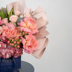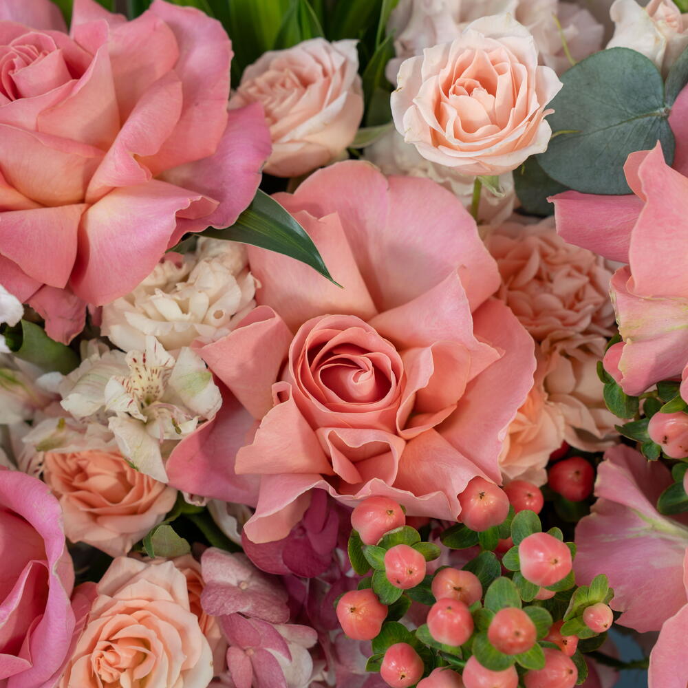 alstroemeria white - 1 шт. hydrangea pink - 1 шт. rose hermosa - 5 шт. spray rose pink - 3 шт. Песня Индии - 1 шт. светло-розовая эустома - 1 шт. гиперикум светло-красный - 2 шт.