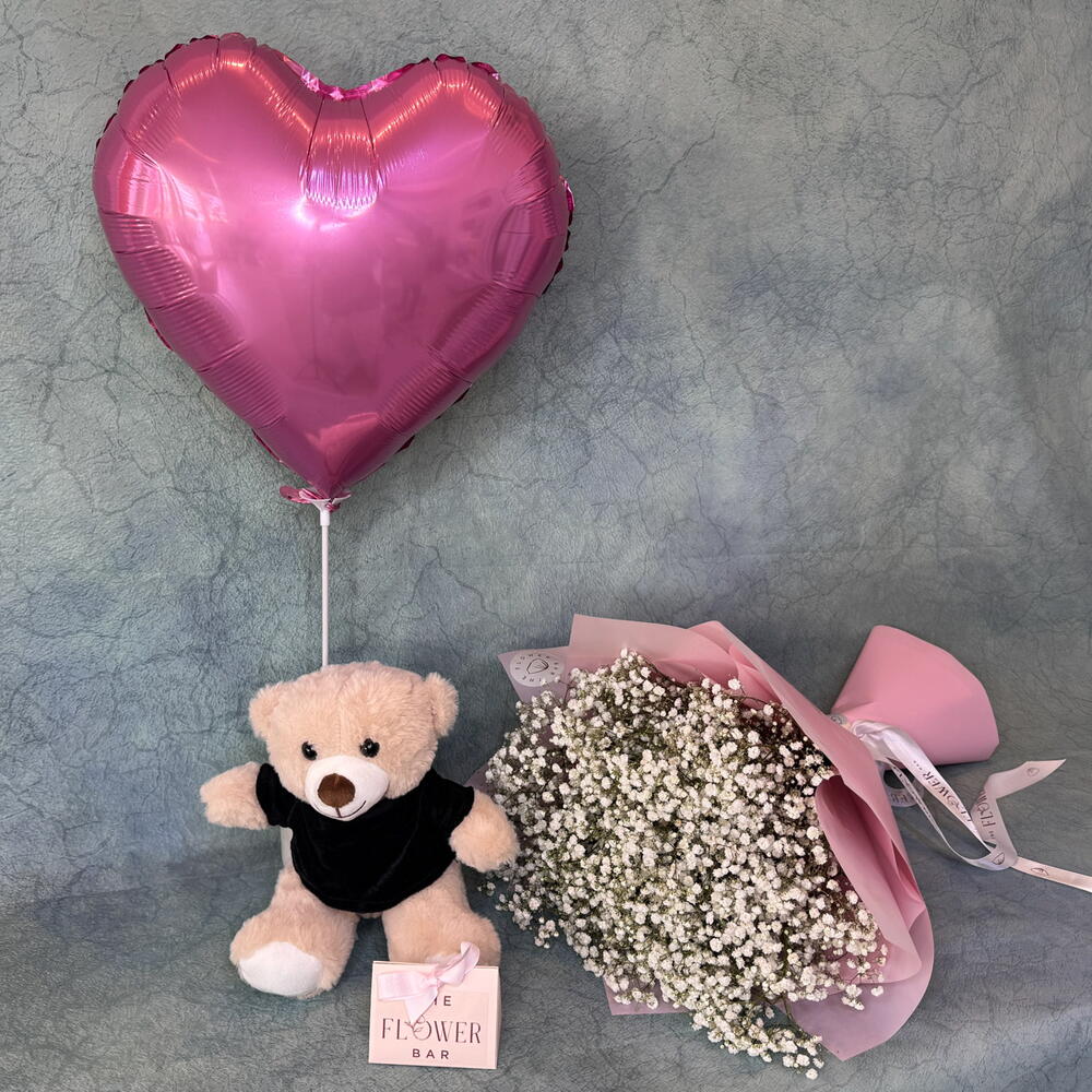 белая гипсофила - 15 шт. подарочный пакет - 1 шт. упаковка букета - 1 шт. розовая коробка с 4 шоколадными конфетами ассорти - 1 шт. мягкий плюшевый мишка - 1 шт. розовый фольгированный шар-сердце с гелием - 1 шт.