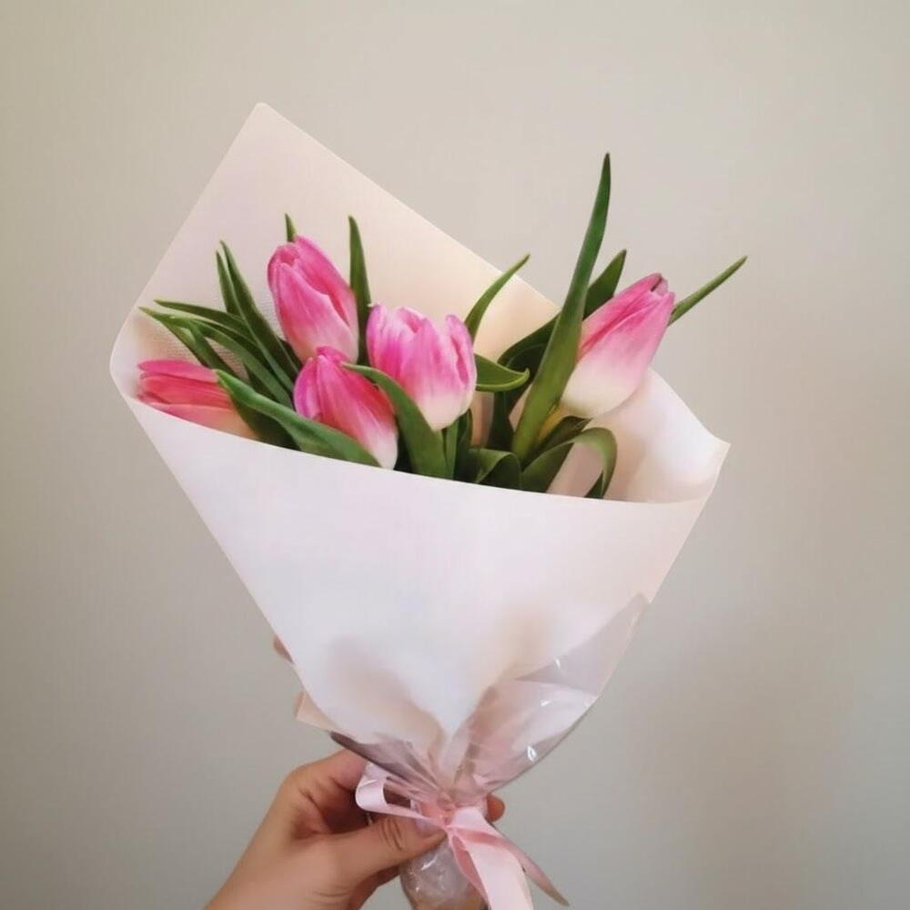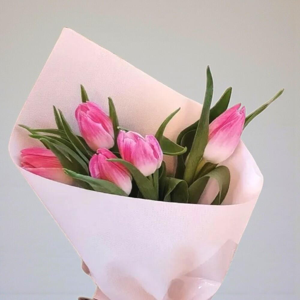 Этот нежный букет розовых тюльпанов излучает грацию, элегантность и очарование. Каждый цветок символизирует нежность, счастье и новые начинания, что делает его идеальным подарком для любого случая. Упакованный в мягкую пастельную бумагу с нежной лентой, этот букет передаёт красоту весны и наполняет воздух свежестью. Будь то день рождения, годовщина или просто чтобы скрасить чей-то день, эти тюльпаны — вневременный выбор. Их ярко-зелёные стебли и пышные лепестки создают гармоничный баланс цвета и природы. Чтобы сохранить их свежими, поместите их в чистую воду и держите вдали от прямых солнечных лучей.