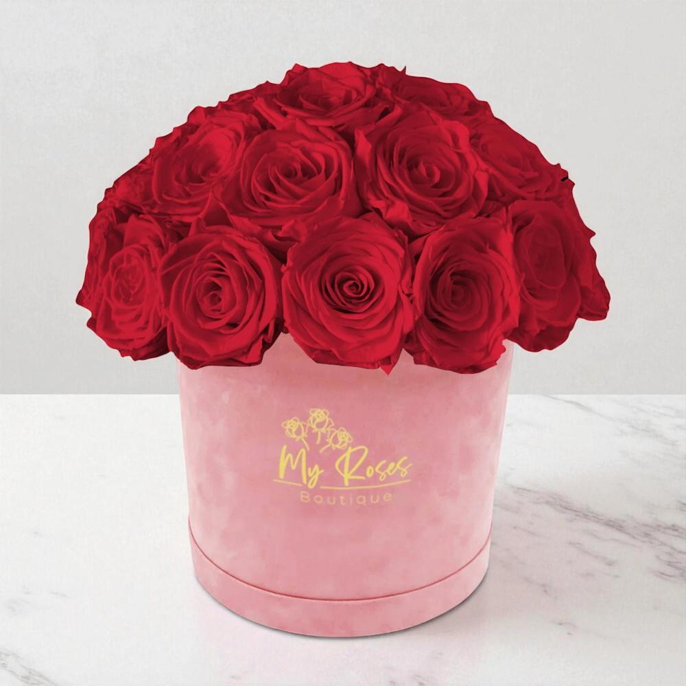 Розовая бархатная коробка с 36 красными розами