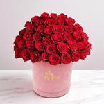 Розовая бархатная коробка с 50 красными розами