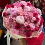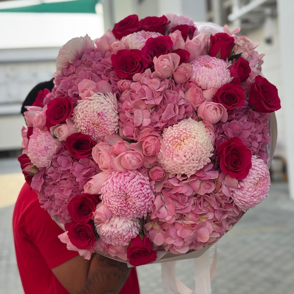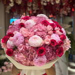 Pink Velvet Cloud — это роскошный, пышный букет, созданный, чтобы произвести впечатление. Мягкие нежно-розовые гортензии образуют насыщенную, облакообразную основу, в то время как нежные розы цвета румянца добавляют изящества и романтики. Насыщенные тёмно-красные розы вносят контраст и страсть, а крупные розовые хризантемы усиливают фактуру своими плюшевыми, бархатистыми соцветиями.