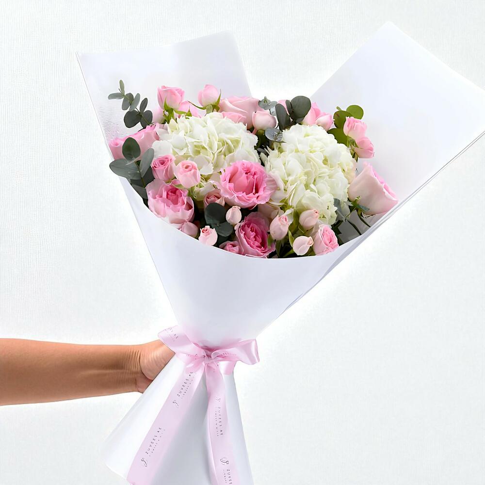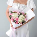 Этот очаровательный букет включает 7 роз Mandela розового оттенка, 7 кустовых роз Dinara и 2 пышные белые гортензии, и изящно дополнен 5 стеблями свежего рускуса и 3 веточками эвкалипта для нотки природной зелени. Цветы завернуты в плотную белую бумагу и перевязаны нежно-розовой лентой, создавая изящное оформление, идеально подходящее для подарка.