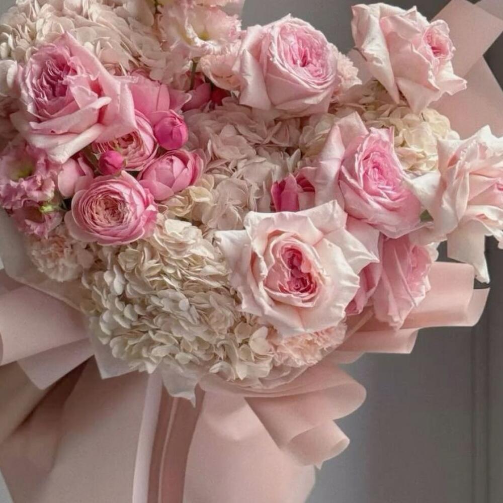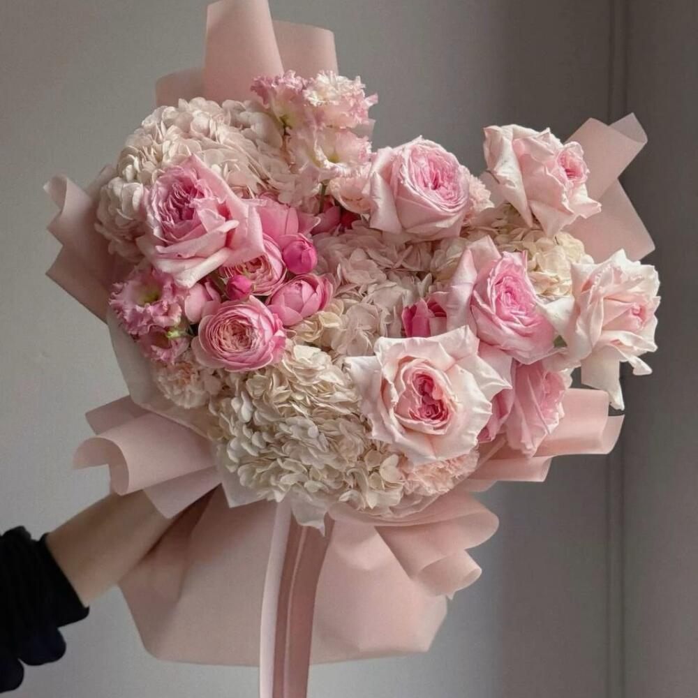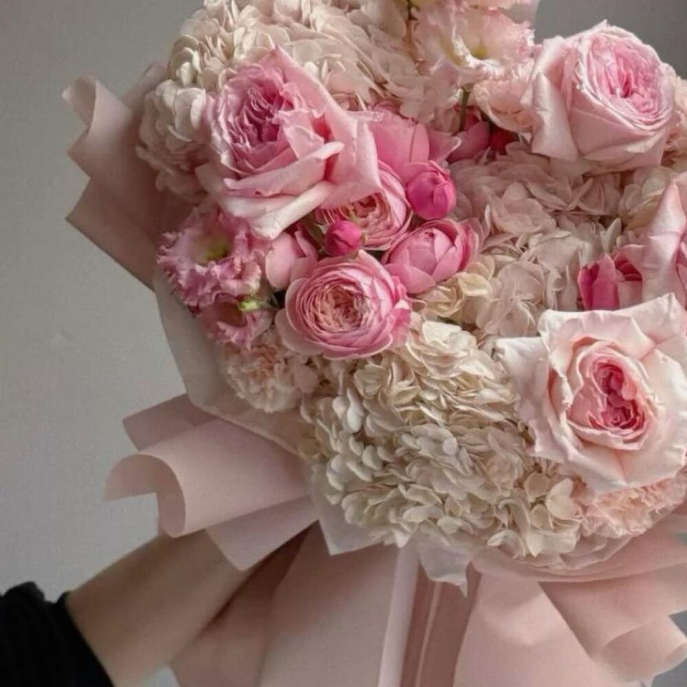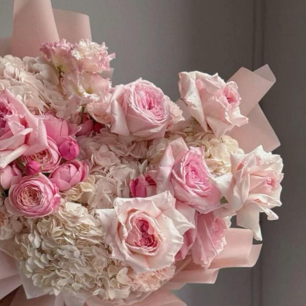 Завораживающее сочетание нежно-розовых роз, пышных садовых цветов и объёмных гортензий, оформленное в пастельно-розовую бумагу и завершённое элегантной атласной лентой. Этот букет излучает романтику и нежность, делая его идеальным выбором для годовщин, дней рождения или искренних проявлений любви.