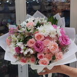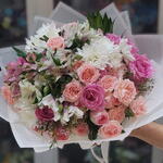 Greenery - 3 шт. white alstroemeria - 4 шт. pink alstroemeria - 2 шт. white chrysanthemums - 3 шт. wox - 2 шт. pink roses - 11 шт. розовые мини-розы - 5 шт.