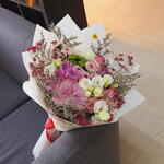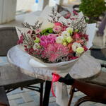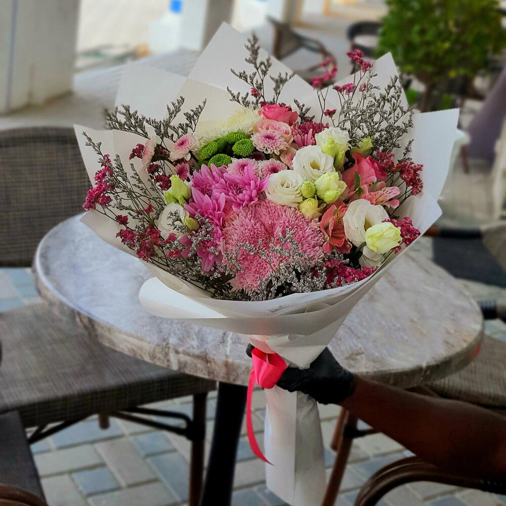Eustoma - 4 шт. белая роза - 3 шт. pink roses - 2 шт. хризантемы поштучно - 1 шт. букет в упаковке - 1 шт. хризантемы на стебле - 4 шт. микс лимониумов - 4 шт.
