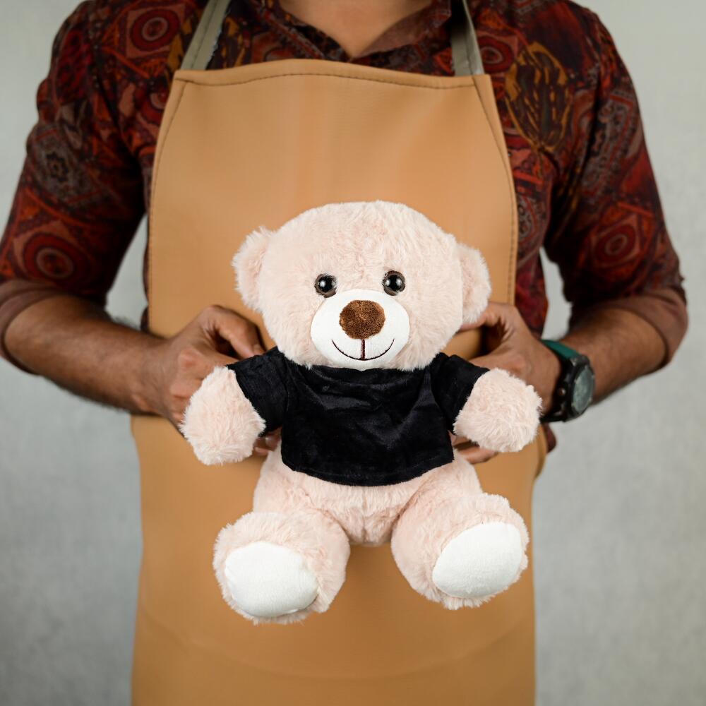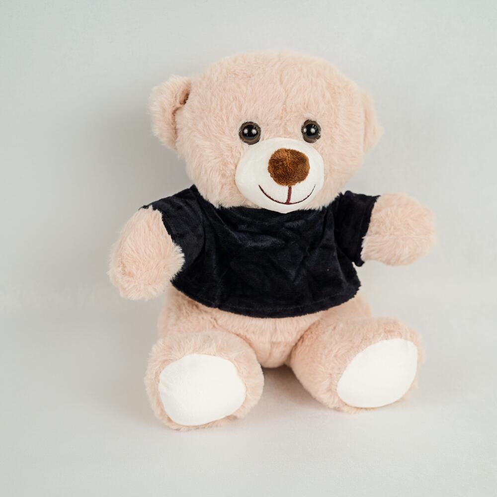 Светло-коричневый плюшевый мишка в чёрной футболке-5444