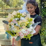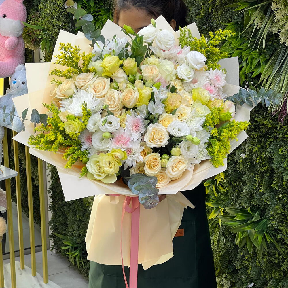 white chrysanthemum - 4 шт. solidago yellow - 4 шт. ветки эвкалипта - 3 шт. стебли белого лизиантуса - 5 шт. персиковая эустома - 5 шт. персиковые спрей-розы - 5 шт. стебель белой альстромерии - 5 шт. персиковая бумага - 9 шт. white roses stems - 5 шт.
