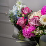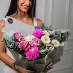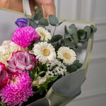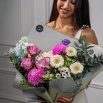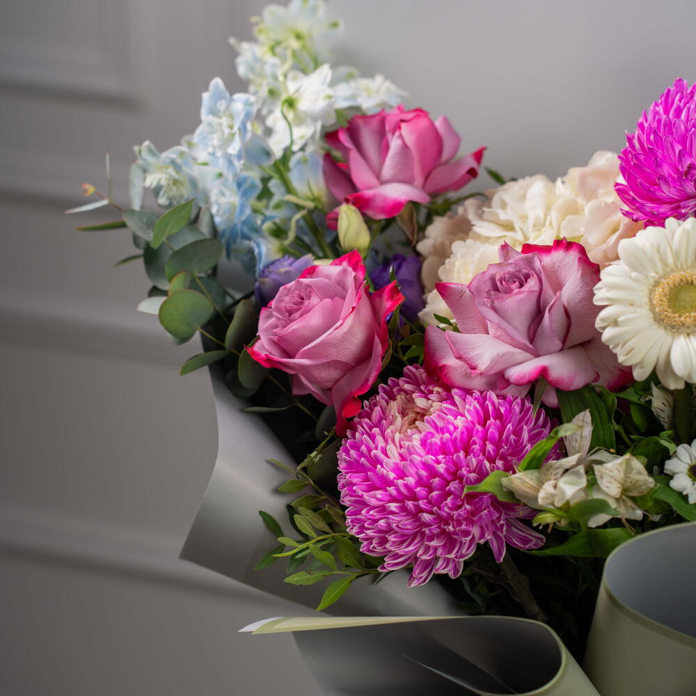 Eucalyptus - 3 шт. rose Deep purple - 3 шт. Alstroemeria - 3 шт. гермини белая - 3 шт. santini white - 1 шт. фиолетовая эустома - 3 шт. хризантема пионы розовый - 2 шт. дельфиниум небесно-голубой - 3 шт.