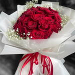 Побалуйте свои чувства этим потрясающим моно-букетом, тщательно выполненным вручную из 20 премиальных красных роз. Эти сияющие цветы, символизирующие любовь и уважение, элегантно дополнены двумя веточками нежной гипсофилы. Этот прекрасный ансамбль несомненно станет классическим украшением, которое подчеркнёт любое событие.