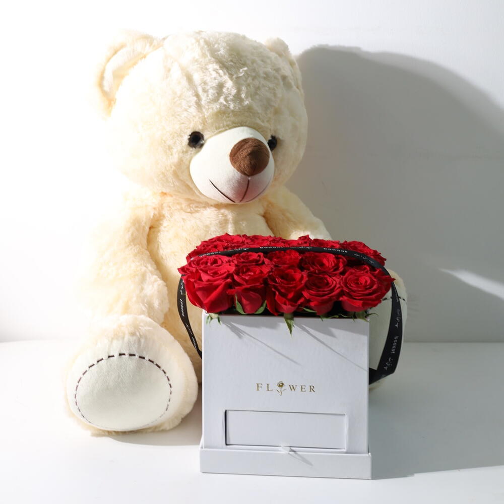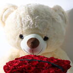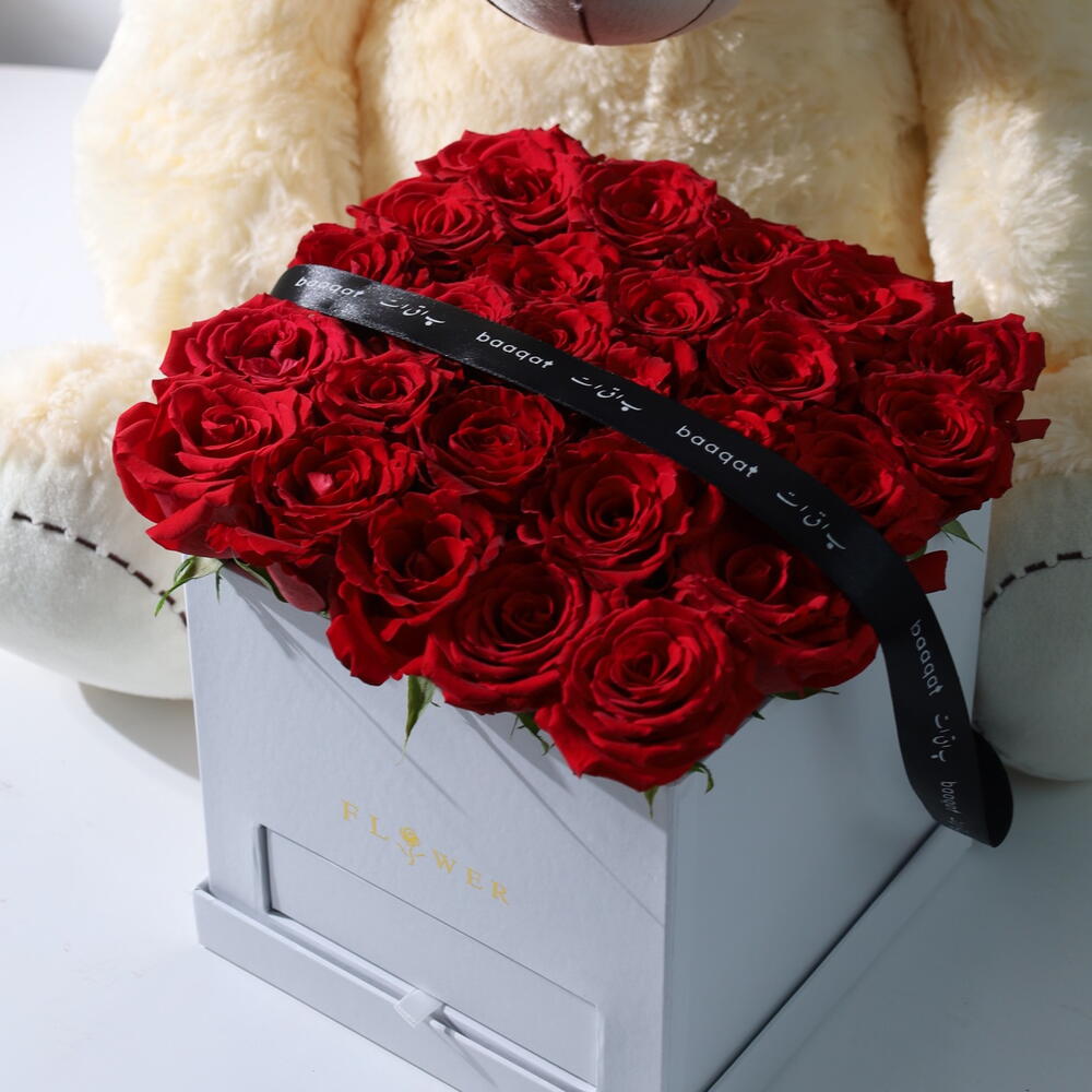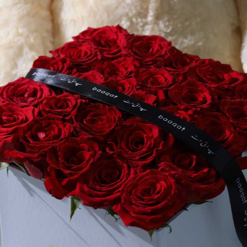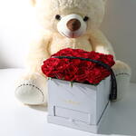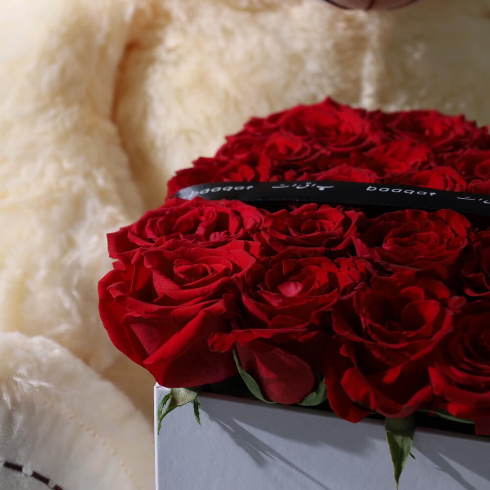 Teddy bear - 1 шт. премиальная красная роза - 26 шт. лента baaqat чёрная - 1 шт.