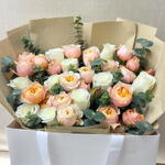 Откройте для себя божественную красоту нашего моно-букета, тщательно собранного с любовью и заботой. Подарок включает 6 восхитительных роз «Джульетта», известных своим светло-персиковым оттенком и утончённым очарованием. Его дополняют 10 безупречных белых роз, придающих композиции неземную элегантность. А добавление 8 освежающих веточек эвкалипта придаёт букету завершённость и привносит нотку природной фактуры и зелени. Эта изысканная композиция идеально подходит, чтобы выразить ваши чувства по любому поводу или просто украсить любимый уголок вашего дома.