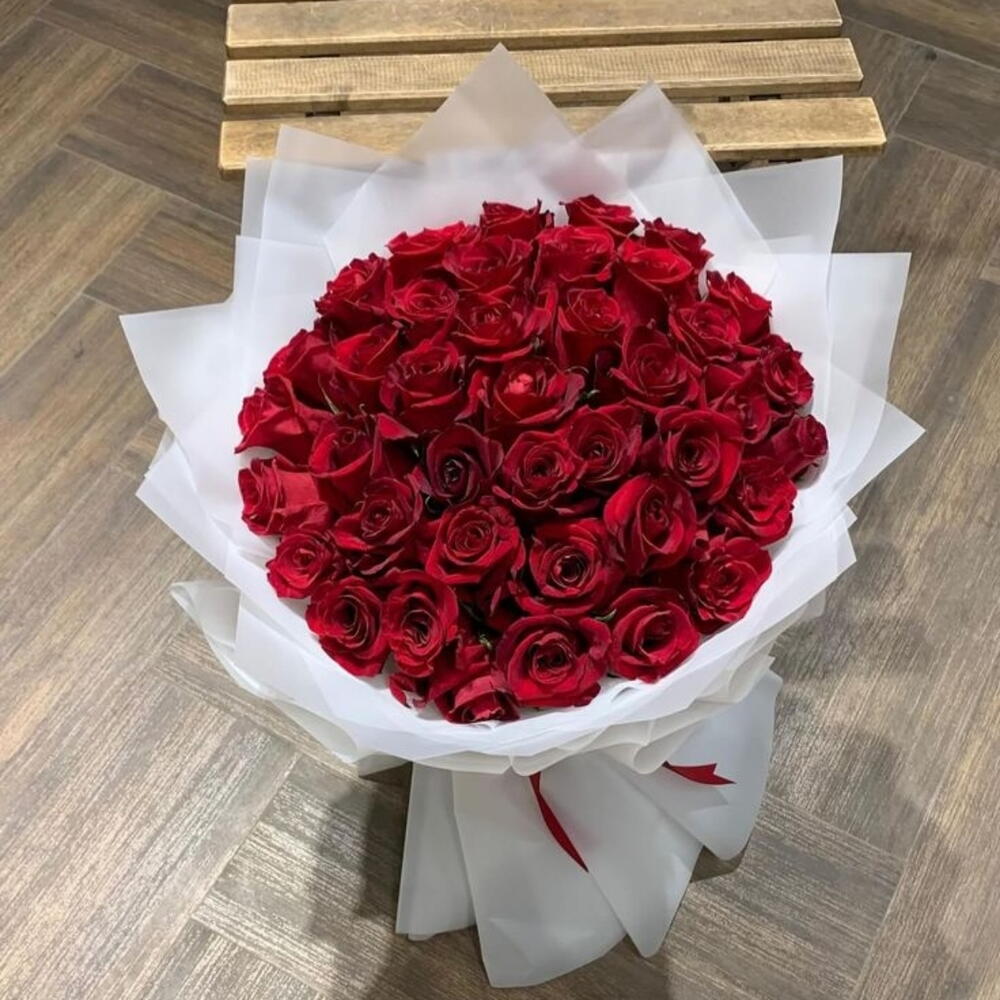 В этом букете — тридцать пять великолепных красных роз, тщательно отобранных за насыщенный цвет и идеальное раскрытие. Премиальные розы изящно уложены, создавая классическую и элегантную композицию. Нежная гипсофила добавляет нотку тонкого контраста и подчёркивает красоту роз. Это продуманный подарок, который наверняка принесёт радость и передаст чувства любви.