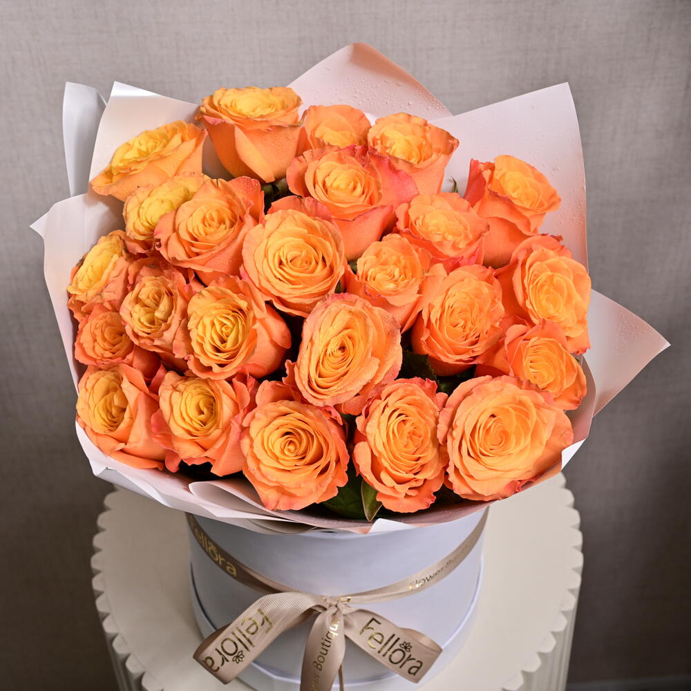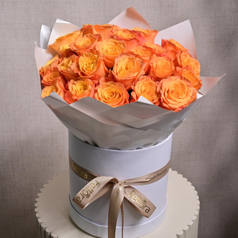 Этот элегантный букет состоит из 25 оранжевых роз премиум-класса, красиво оформленных в шикарной белой шляпной коробке. Мягкий переход оттенков оранжевого к желтому в каждой розе создает яркую и теплую композицию, идеально подходящую для выражения радости, восхищения и нежности. Будь то день рождения, годовщина или просто момент красоты, эта потрясающая цветочная композиция добавит изящества любому событию. Элегантная шляпная коробка дополняет роскошный вид букета, делая его идеальным подарком для тех, кто ценит изысканные детали.
