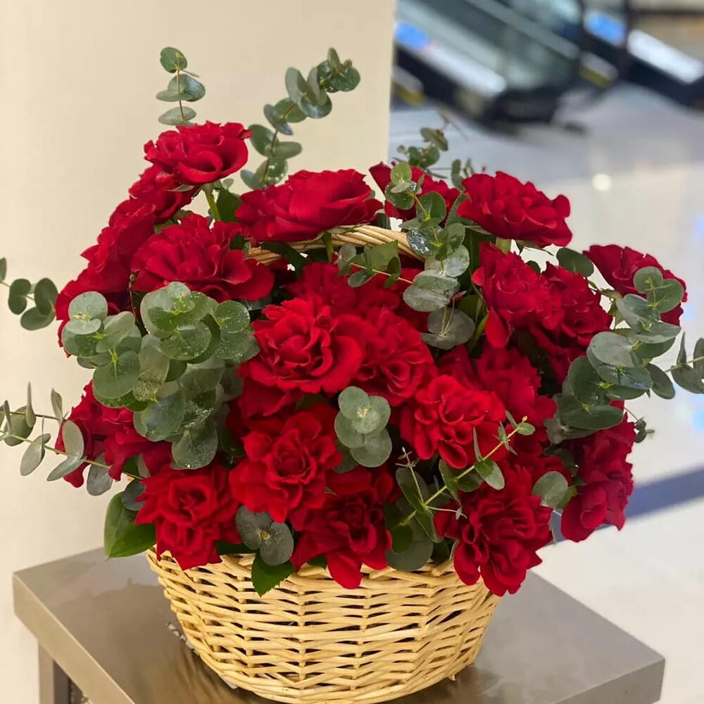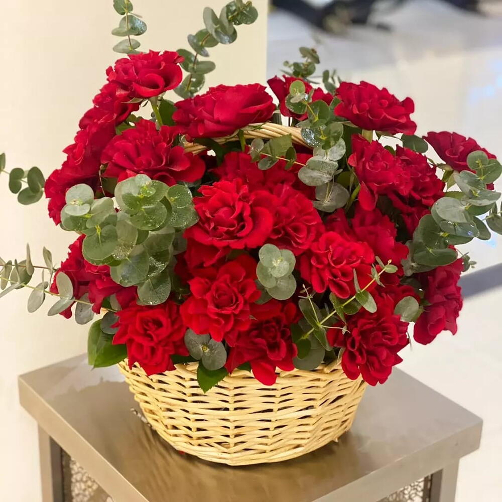 Погрузитесь в завораживающую красоту этой необыкновенной цветочной композиции. В неё входит 51 сияющая красная роза, живописно расположенная в со вкусом выполненной деревянной корзине и изящно дополненная веточками свежего эвкалипта. Этот потрясающий букет непременно восхитит чувства и покорит любого получателя своим несравненным очарованием и утонченностью. Идеально подходит для празднования значимых событий или просто чтобы выразить вашу любовь в великолепном стиле.